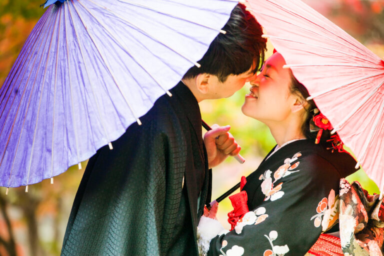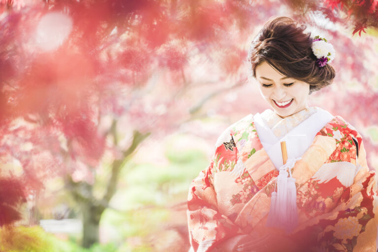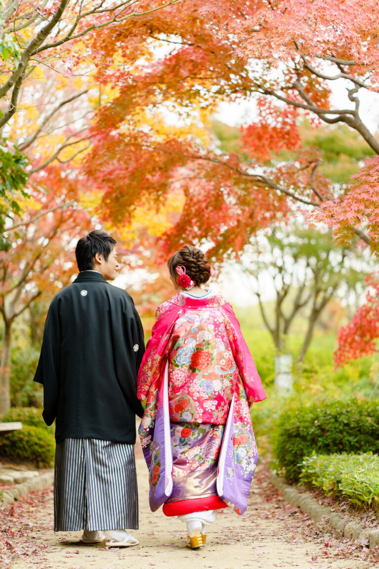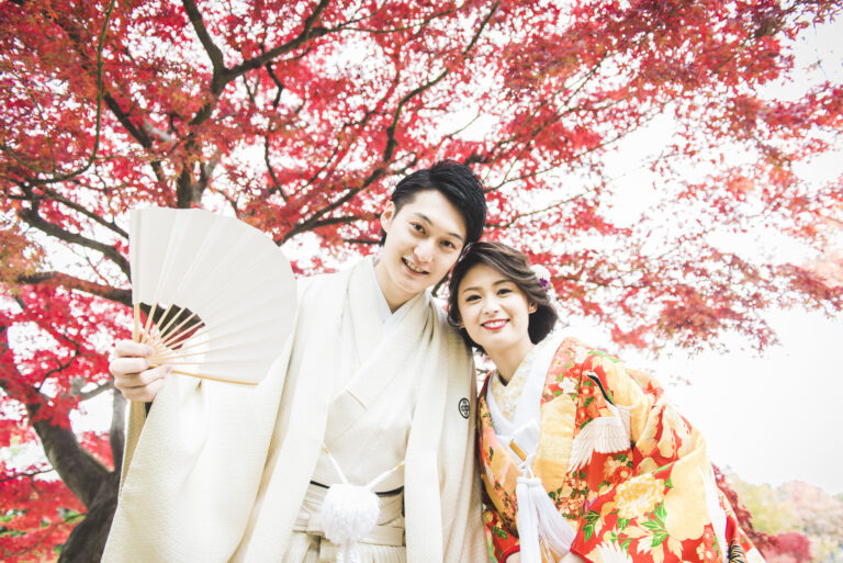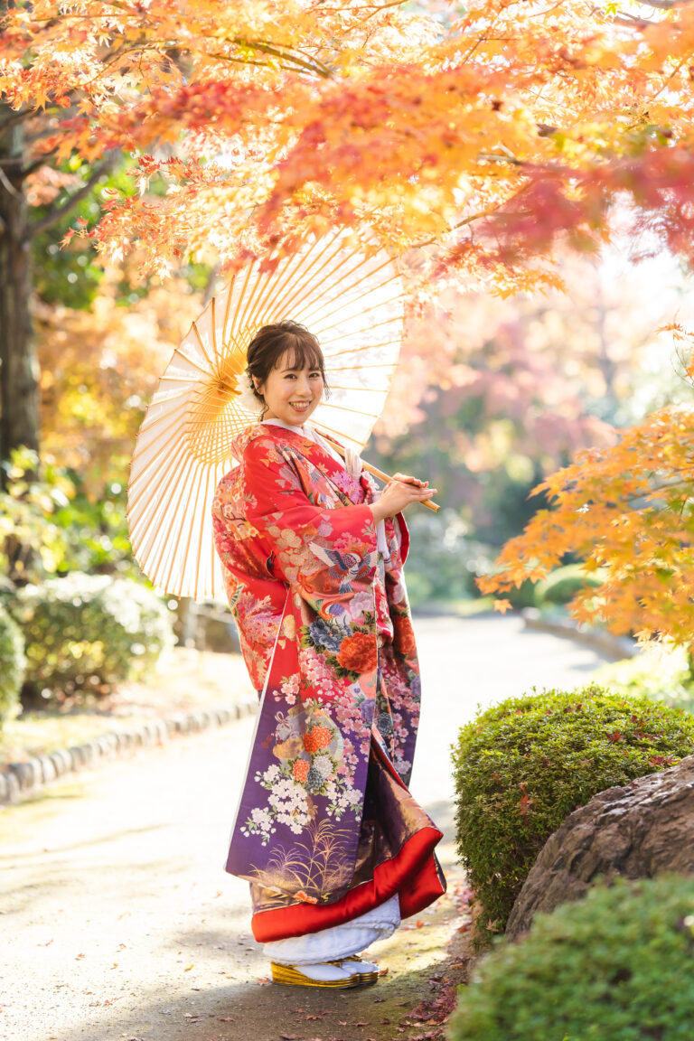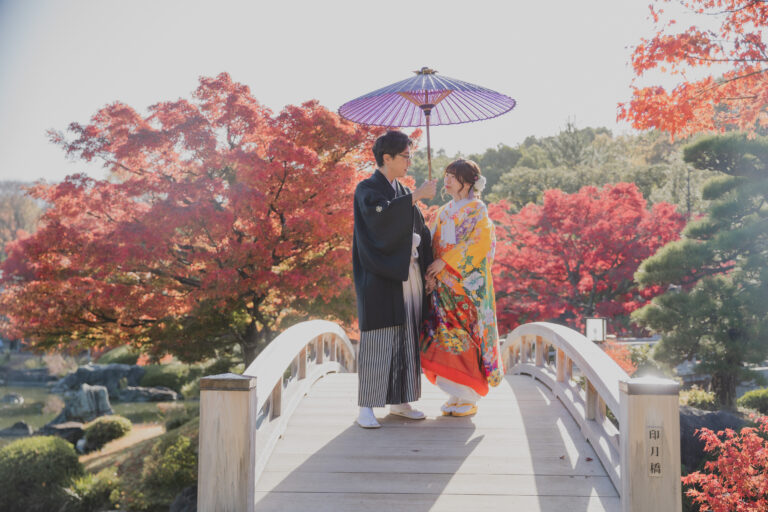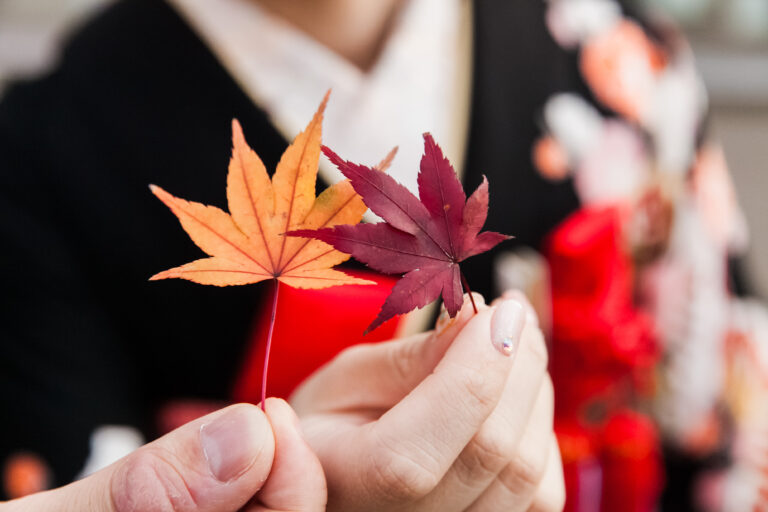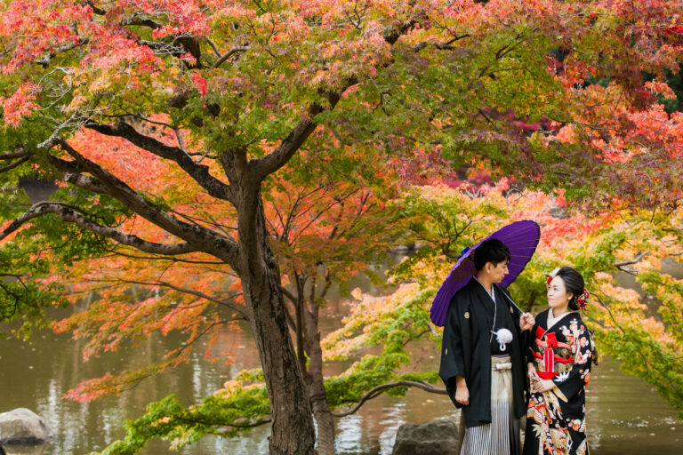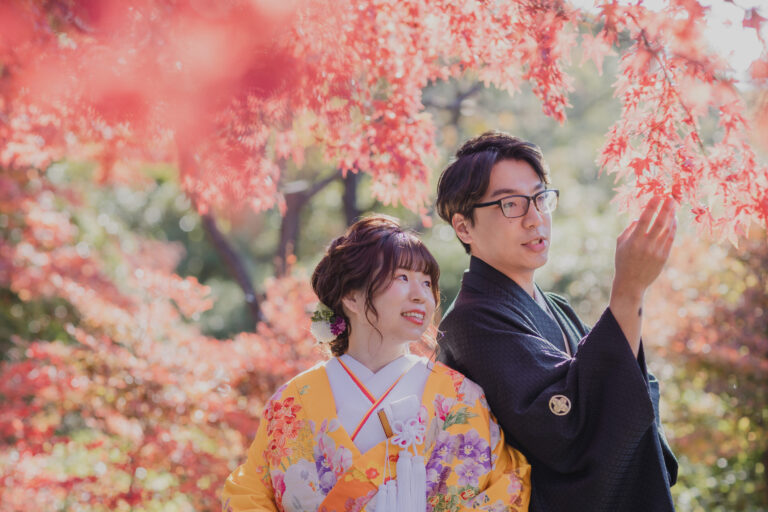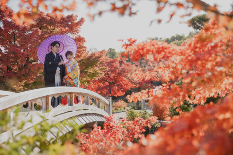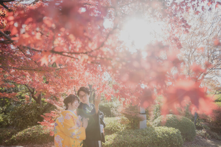 秋限定の紅葉ロケーションプラン。鮮やかに色づいた景色を背景に撮影