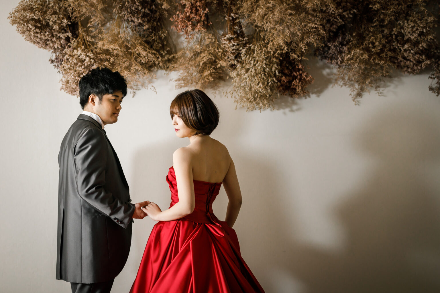 座った姿がバラのように美しい赤のドレスと、光沢のあるグレーのタキシードが 相性抜群で、おふたり並んだ姿がとても綺麗に映えますね♪ シンプルな背景だからこそ、より美しくドレスが映えると思うので、スタジオ撮影には カラードレスがおすすめです! おふたりにとっても特別な記念日になるので、お好きなカラーで華やかに撮影を 楽しんでみてはいかがでしょうか♪