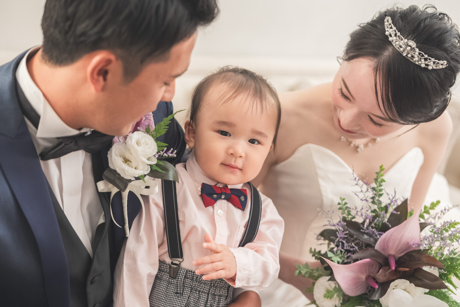 チャペルではおふたりの穏やかな表情がとても印象的で、お子さまも自然に笑顔を見せてくれました。 カラードレスでのスタジオ撮影では、雰囲気をガラリと変え、大人っぽくスタイリッシュに。 家族の絆と多彩な表情を残せた、とても素敵な一日でした。