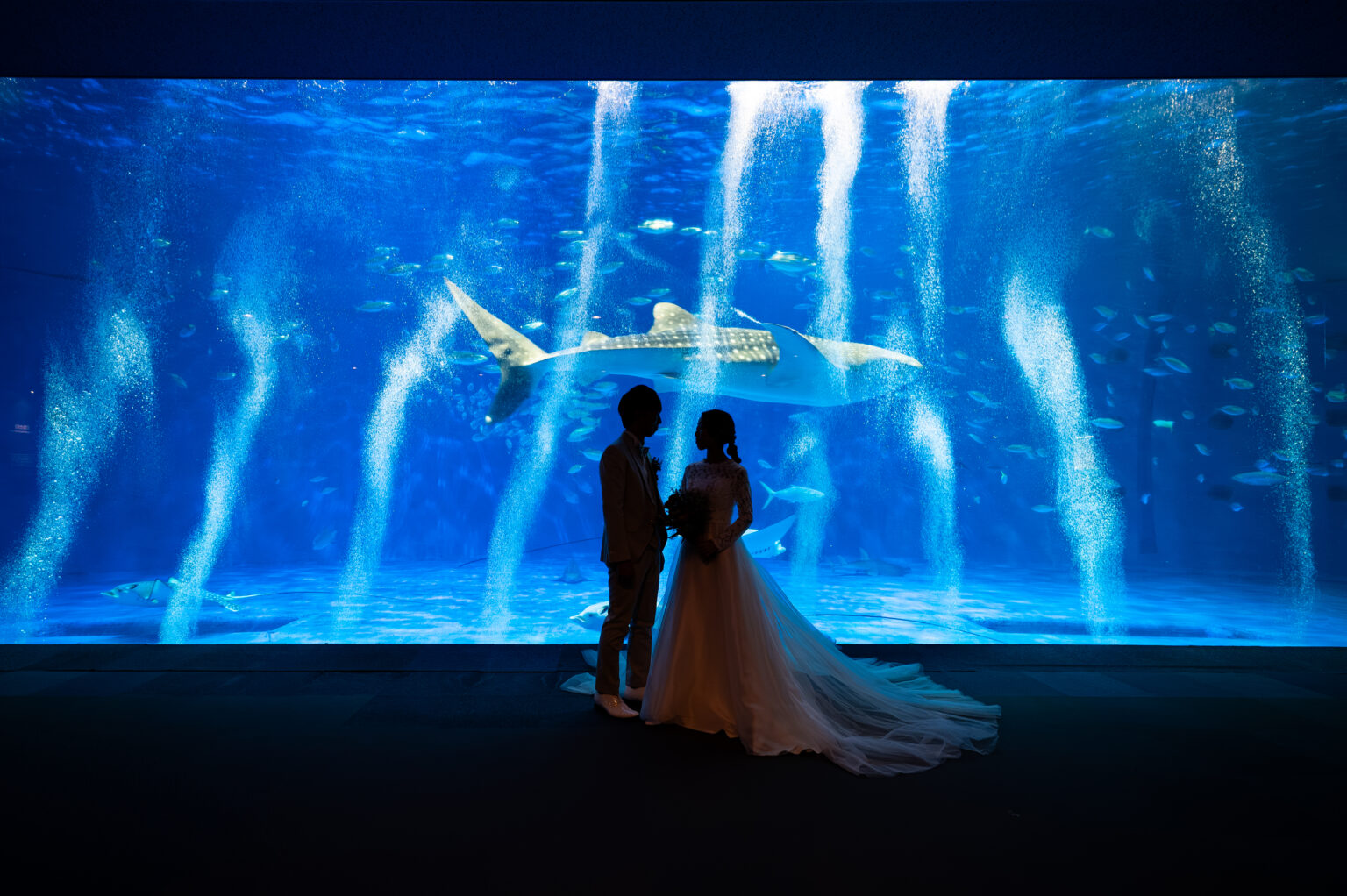 かごしまのデートスポットといえば、 いおワールドかごしま水族館☆ 黒潮大水槽を遊々と泳ぐ11代目ゆうゆうをバックにパシャり 天候に左右されないので お日にちに融通がきかない場合も問題なくお撮影できます!!